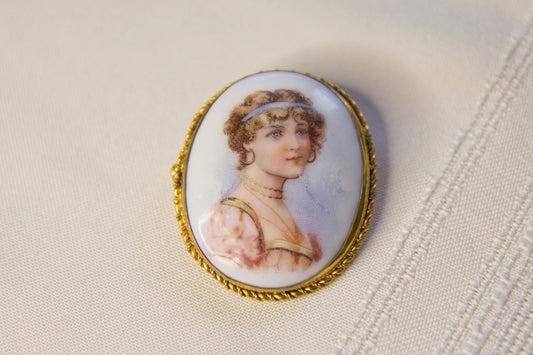 Vintage Painted Female Cameo Portrait Brooch, Pink & Blue Porcelain With Ornate Gold