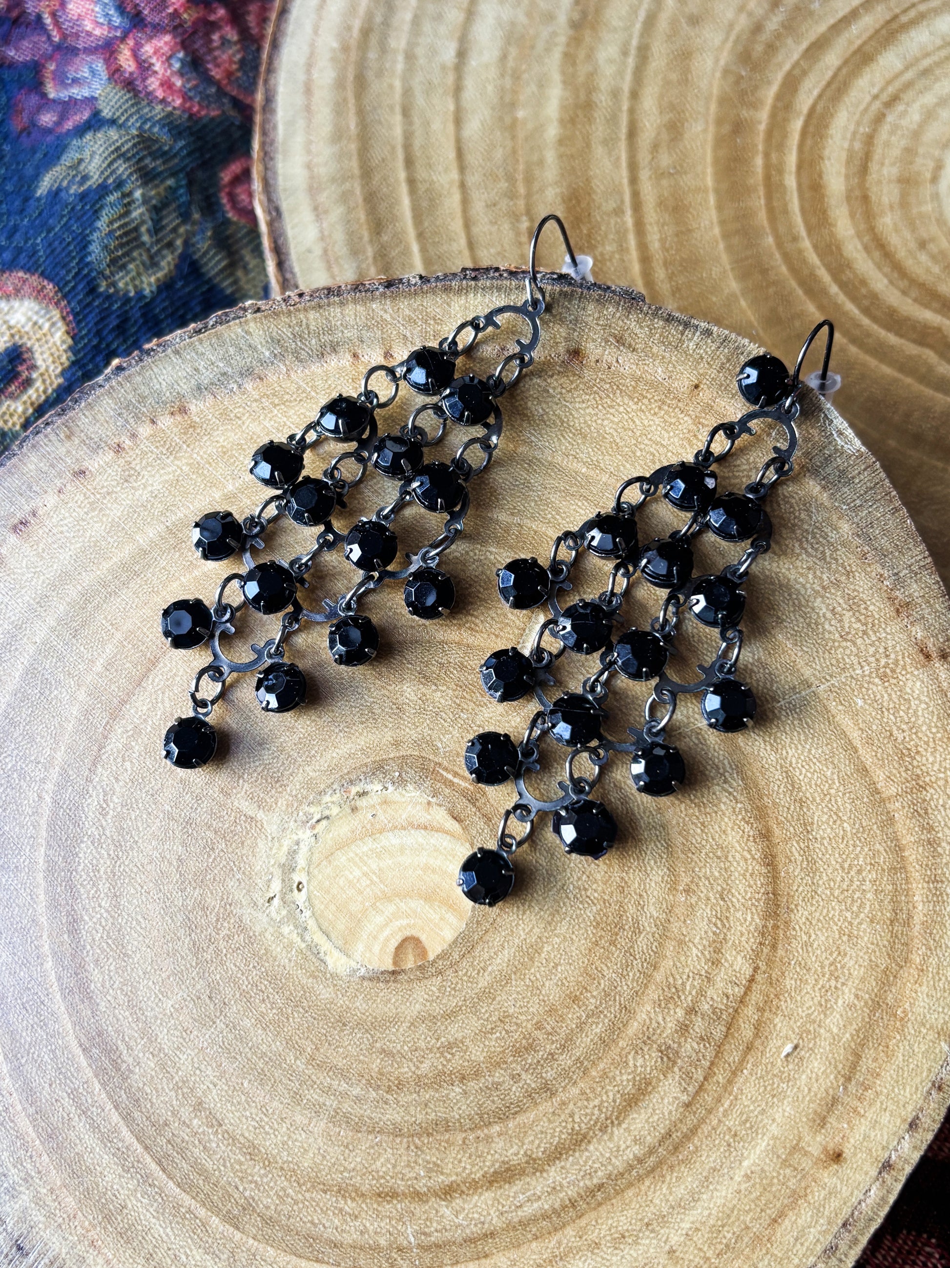 This unique jewelry set includes a pair of large earrings with black stones dangling in a symmetrical diamond shape. It also includes a black choker necklace, with intricately draped beading. This set is sure to make a statement and enhance your collection!