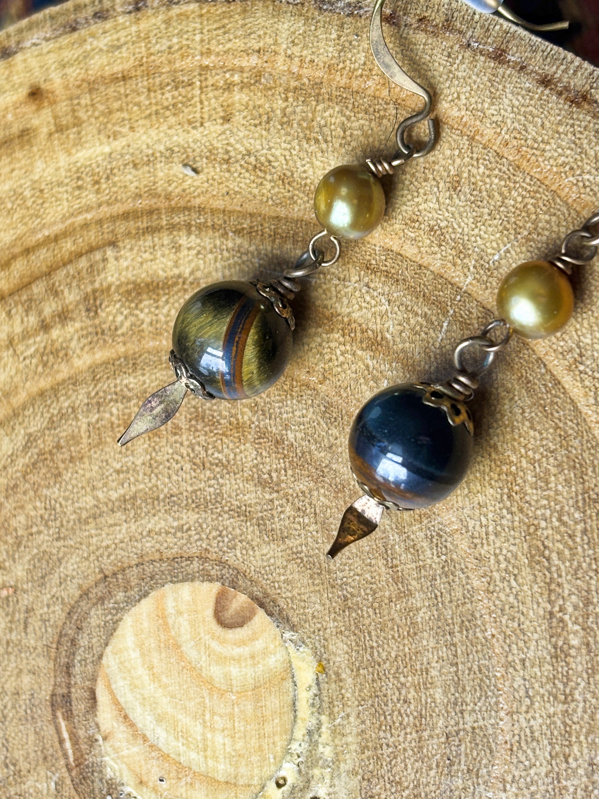 This pair pf earrings is made with beautiful warm toned yellow pearls, along with reflective tigers eye crystal beads. Completed with delicate gold accents, these are a beautiful pair of dainty dangle earrings.