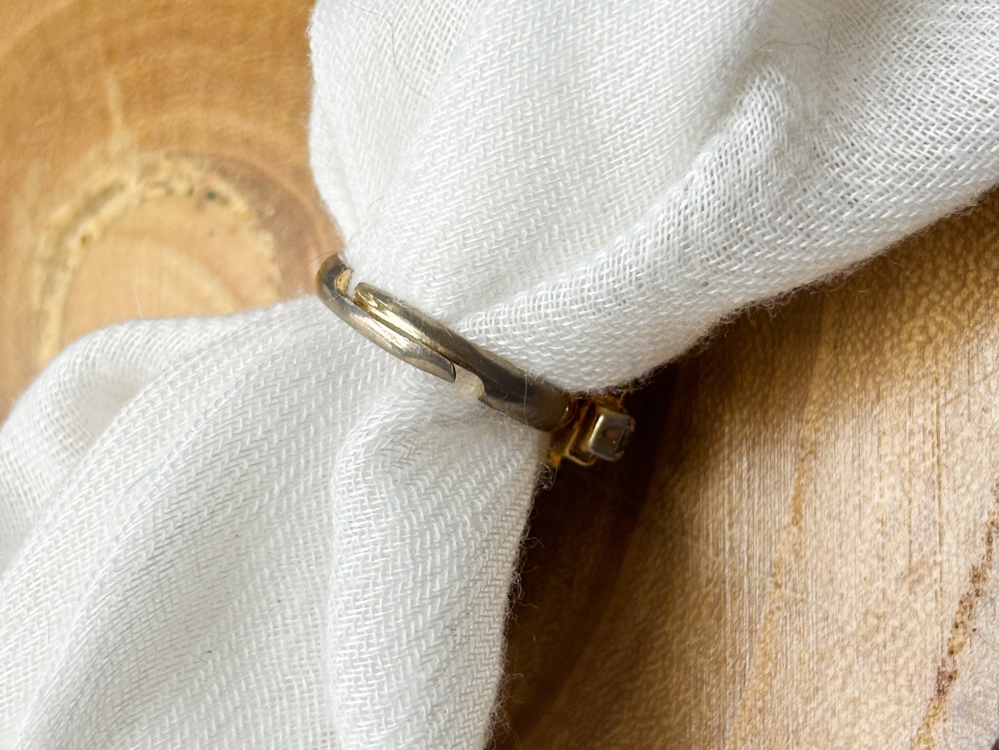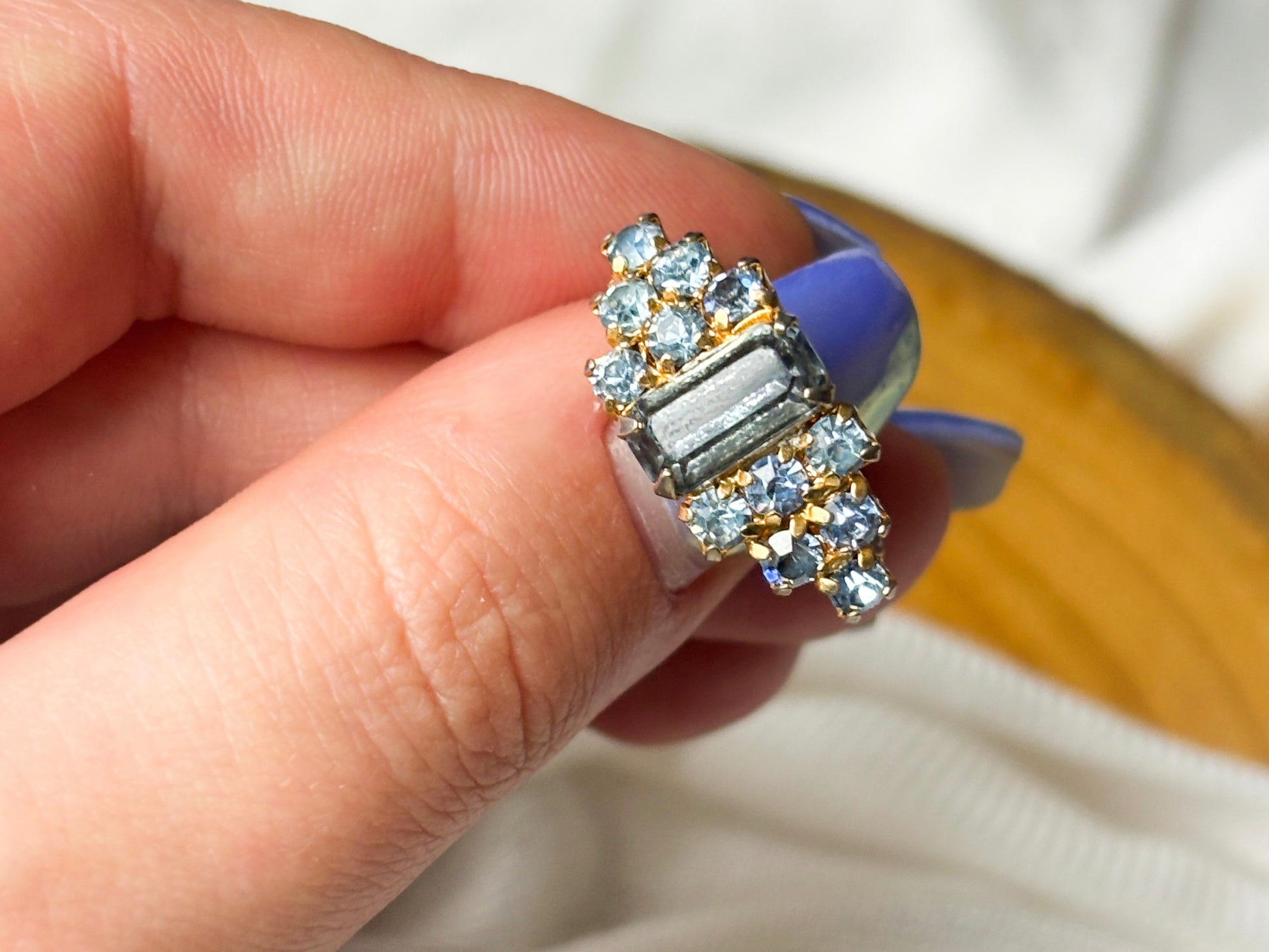 This gorgeous ring is vintage with a large dark blue emerald cut center stone, surrounded by 12 round light blue stones. This is a costume piece, with a gold finish. The band is adjustable, with a more silver finish due to normal wear.