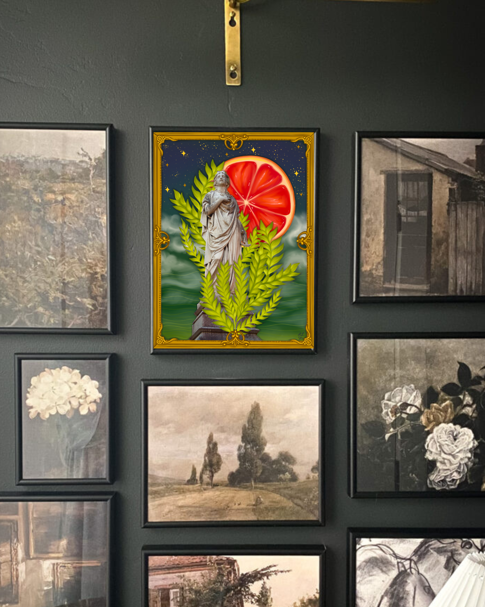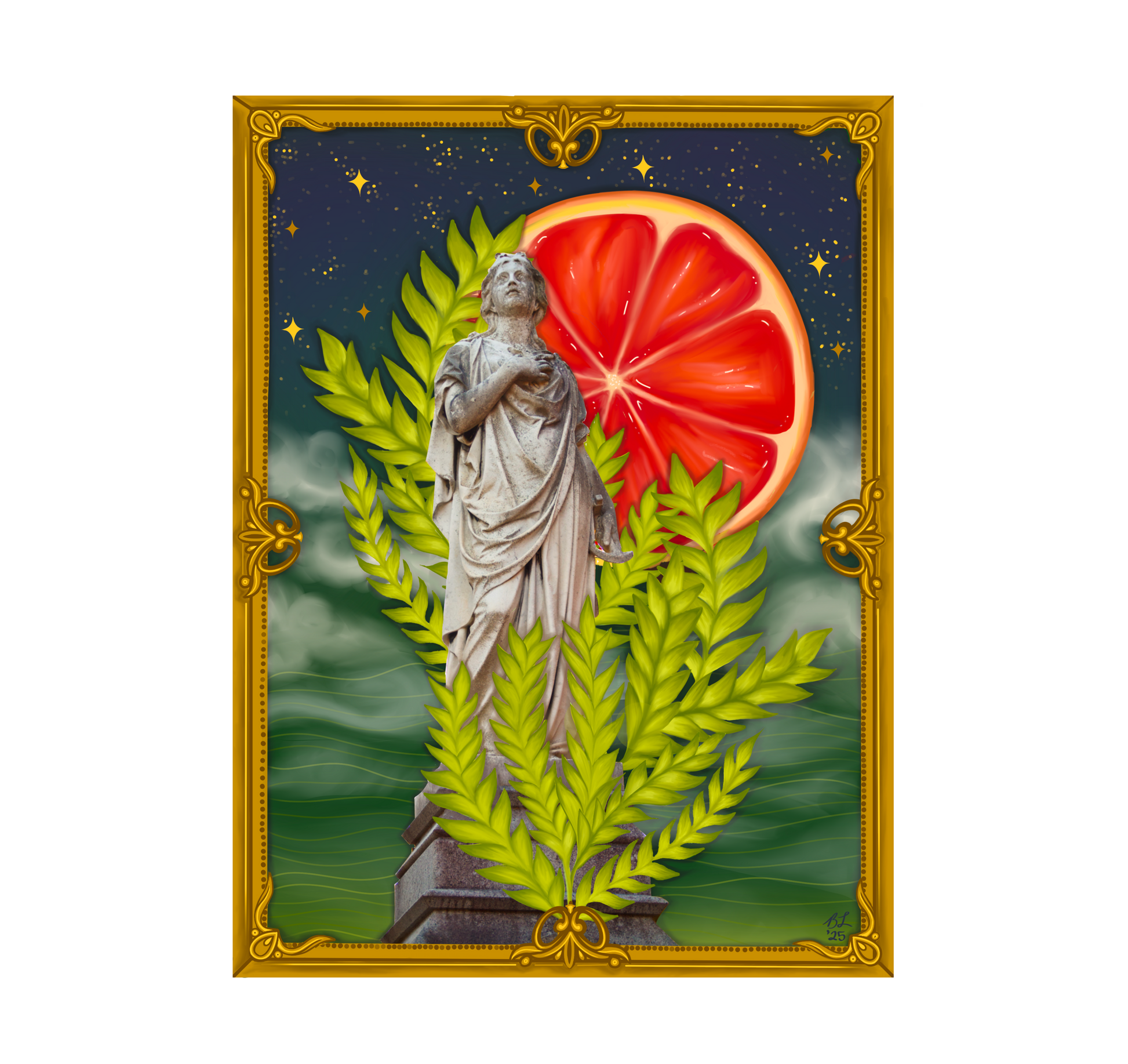 The Maiden of Magic incorporates a photograph of a female statue taken by a local photographer, along with hand drawn elements including a grapefruit sun, wild ferns, and a cloudy celestial background.