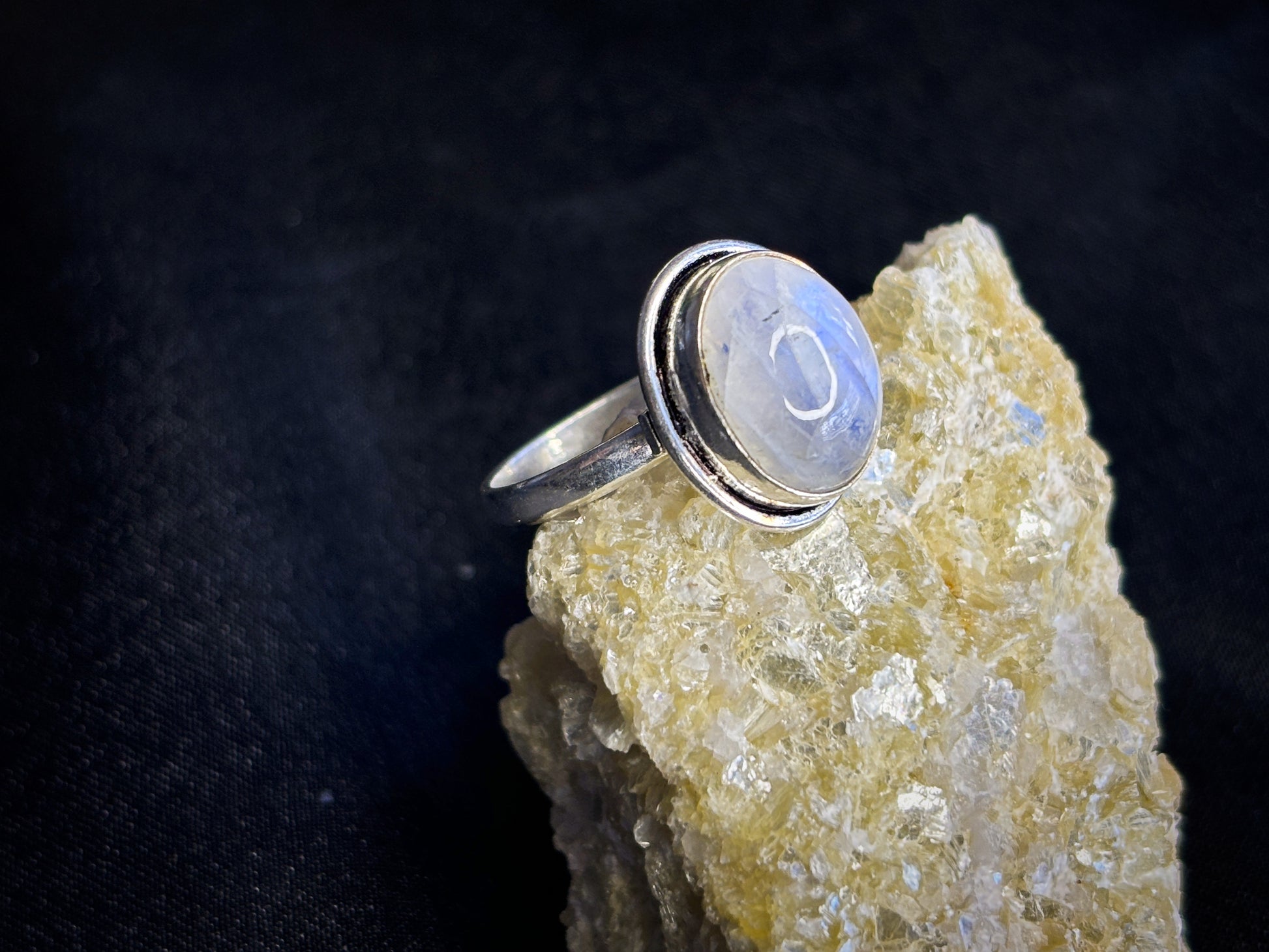 This crystal ring is made with an oval rainbow moonstone, and plated with 925 sterling silver.