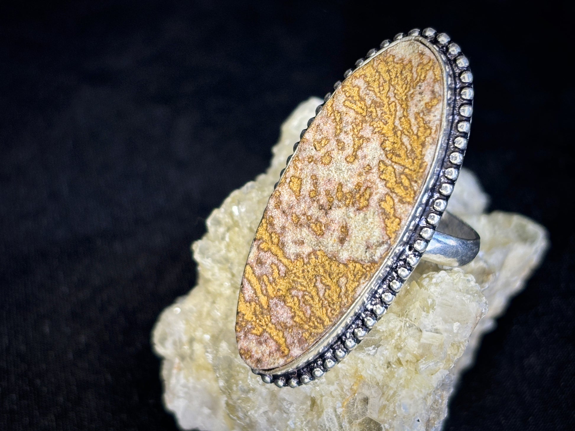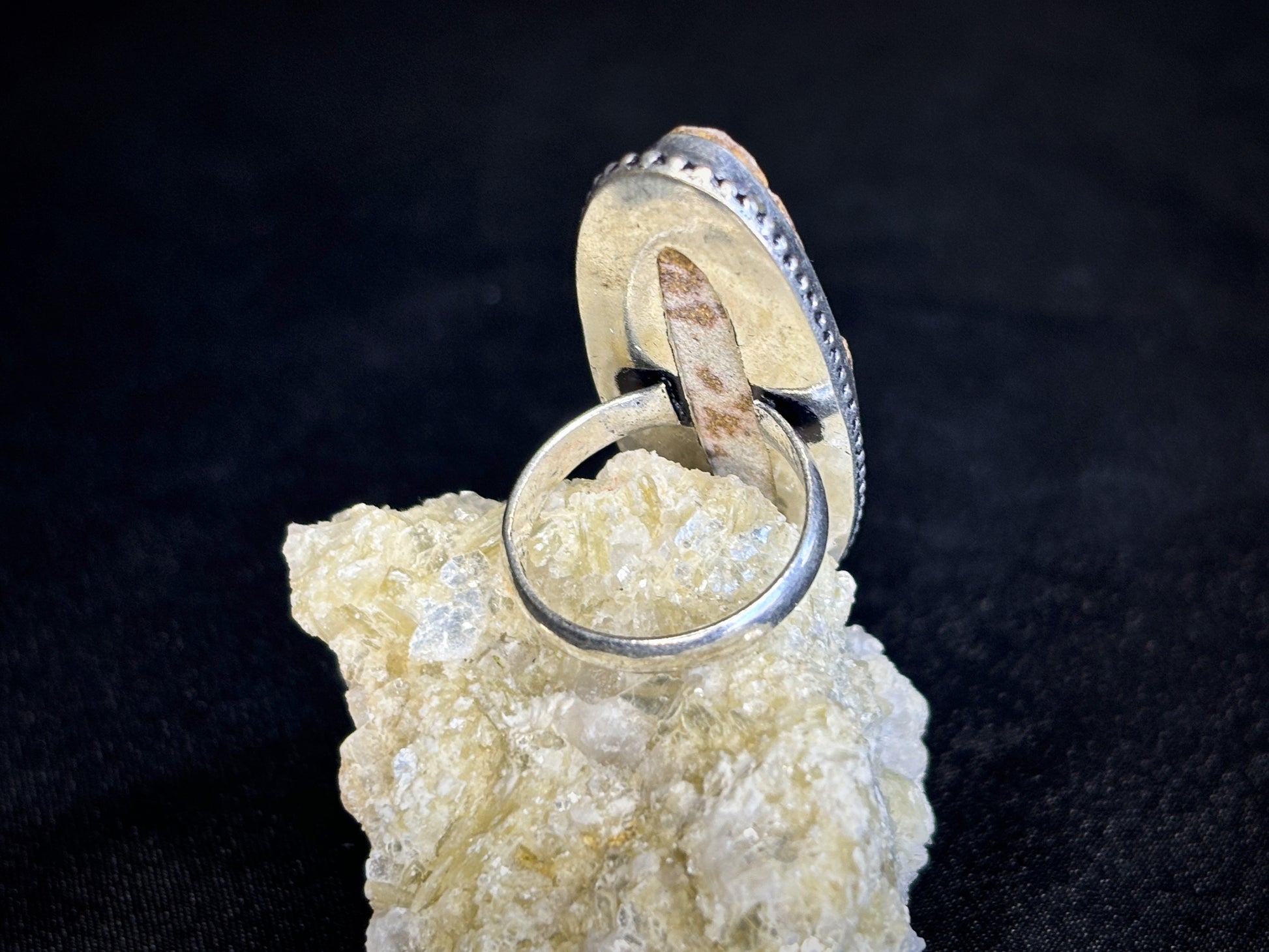 This ring features a unique piece of raw dendritic agate, in a large oval shape. It has shades of orange, pink, and brown, adorned with a sterling silver border & band.