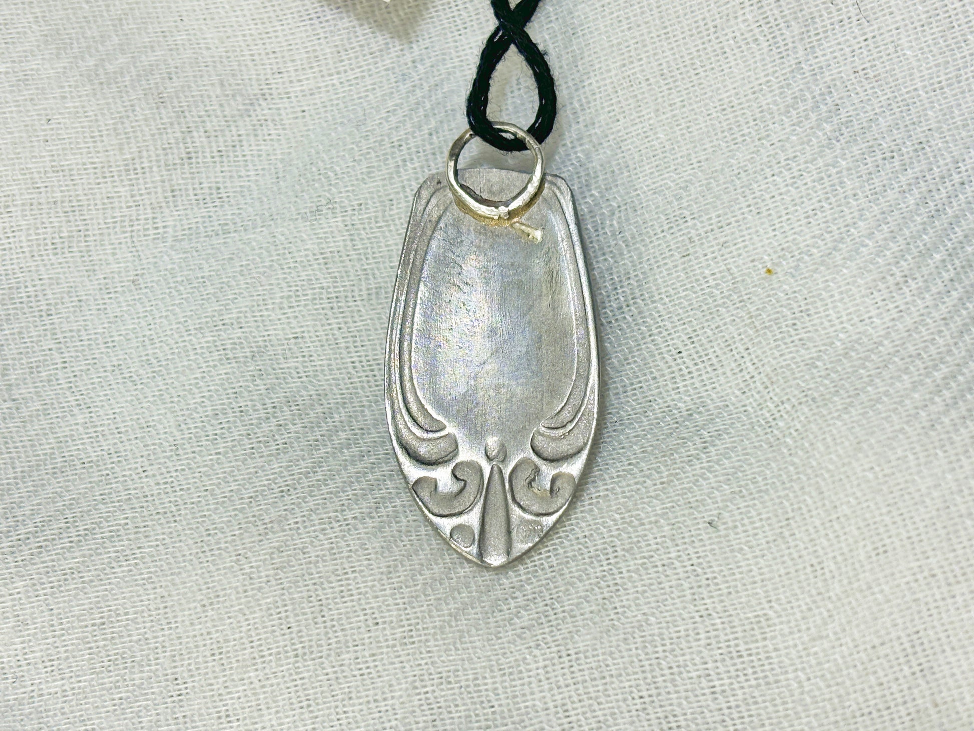 This pendant is handmade by yours truly, with a gorgeous amethyst crystal. The backing has ornate details, and is made from a stainless steel utensil handle. The bezel is sterling silver, as well as the loop to attach it.