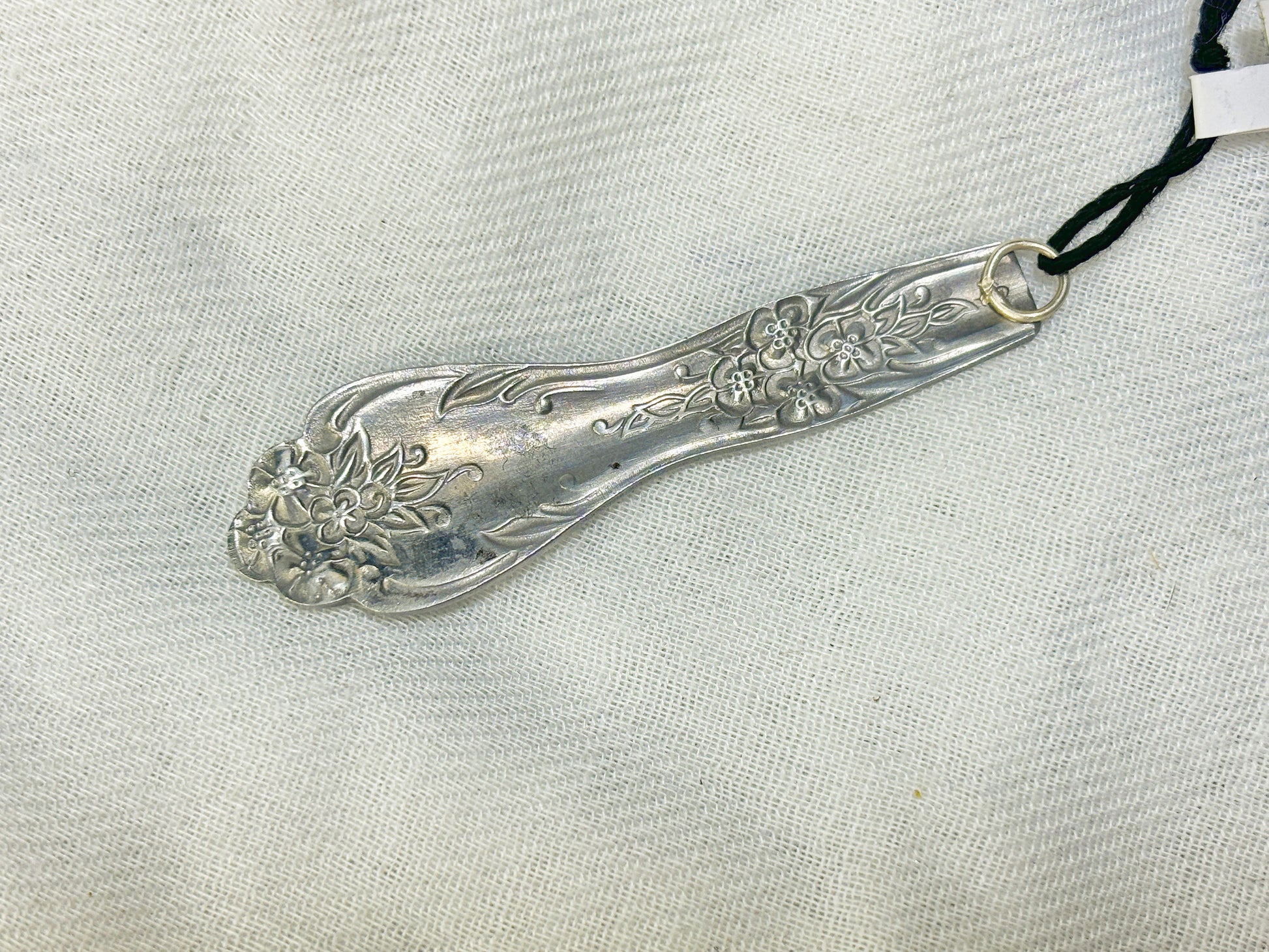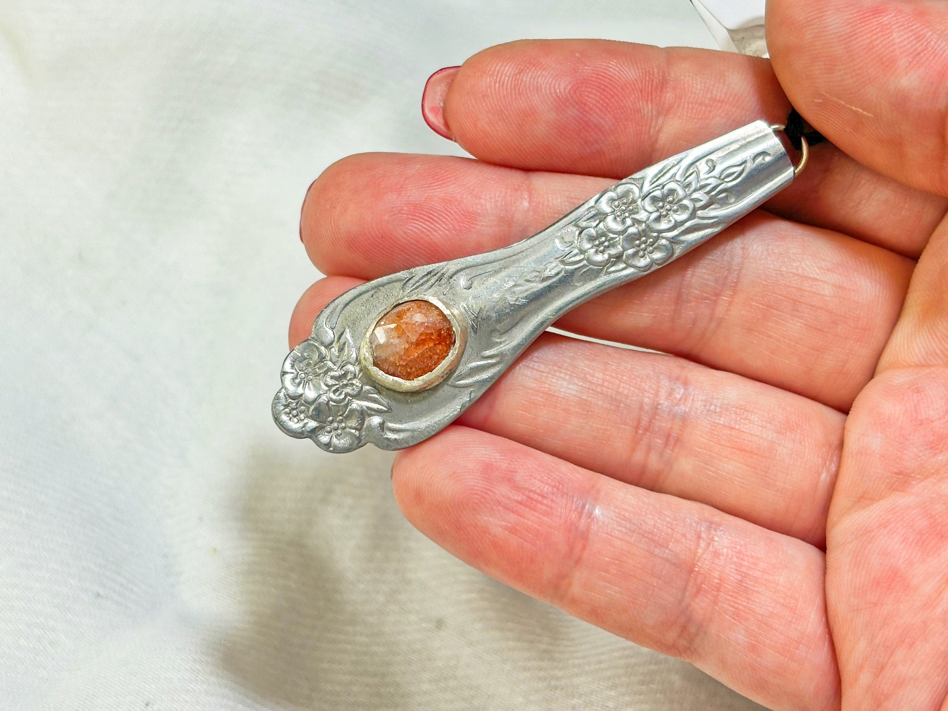 This is one of our handmade, one-of-a-kind pieces! It is made with a beautiful sunstone crystal, set on top of a floral pendant made from a utensil handle.