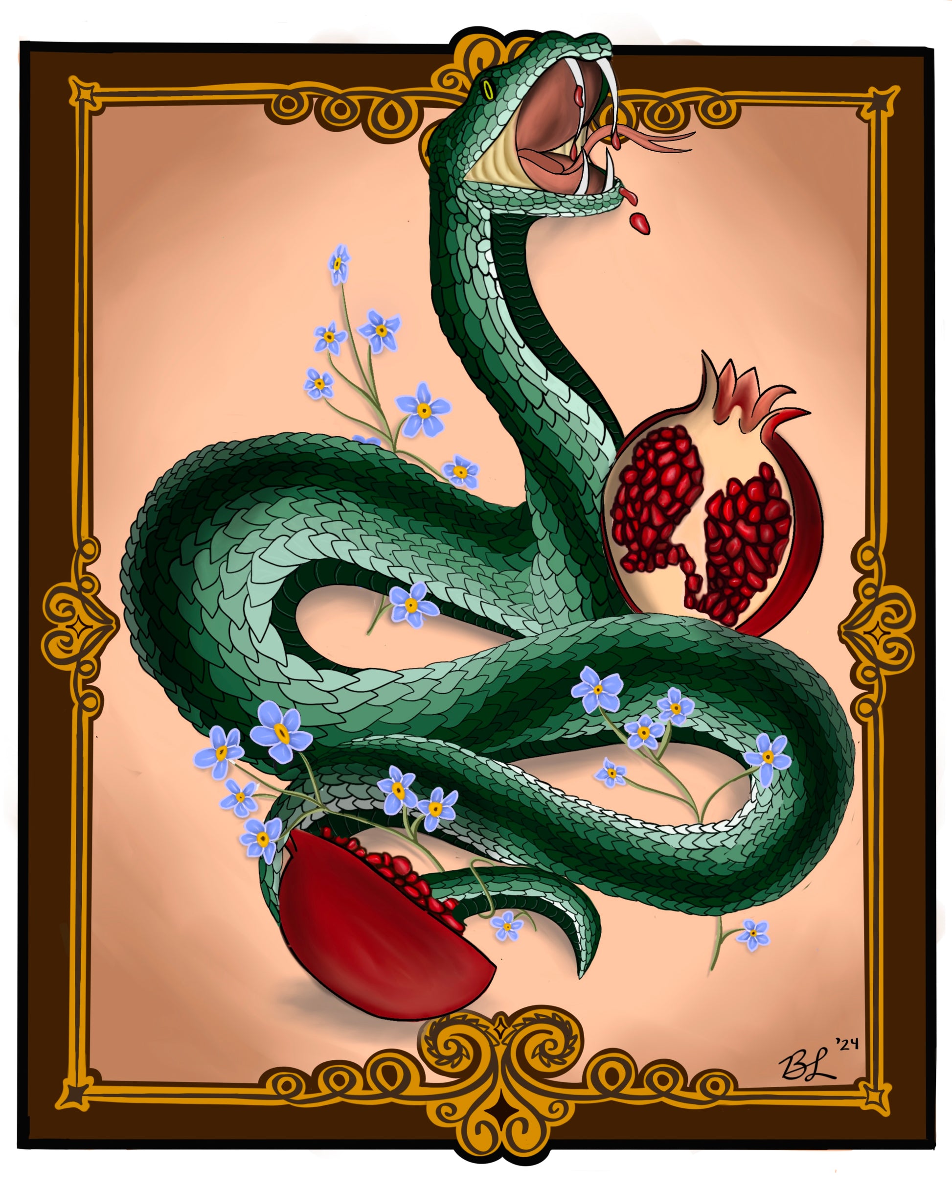 The Lover depicts a snake biting a pomegranate, surrounded by wild Forget-Me-Not flowers.