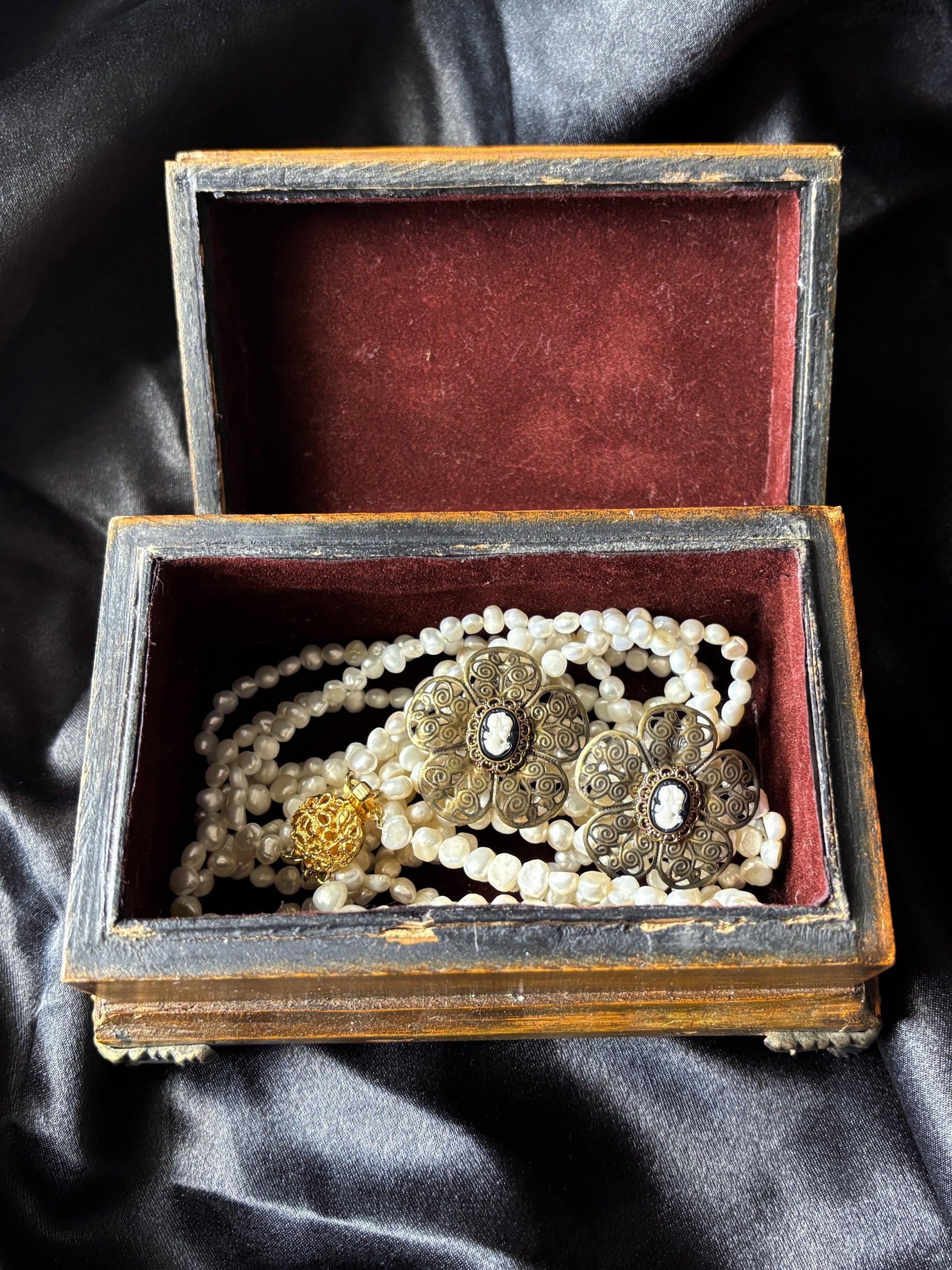 This is a one-of-a-kind vintage gift box, specially curated with a genuine pearl necklace and a pair of vintage cameo statement earrings.